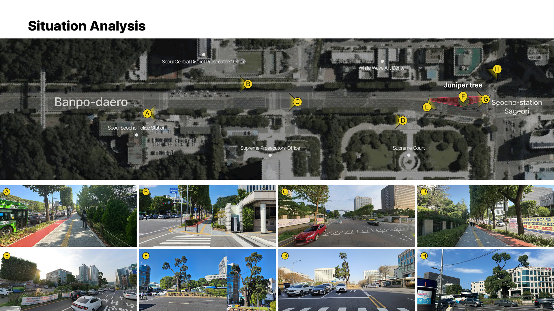 In parallel, a unified brand identity (BI) inspired by the district’s symbolic juniper tree was developed for the Seocho Station intersection area. Wayfinding and information signage utilizing