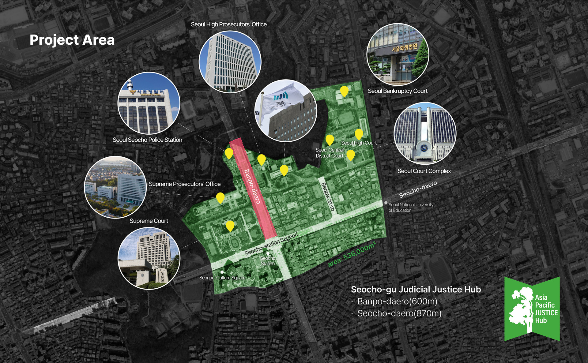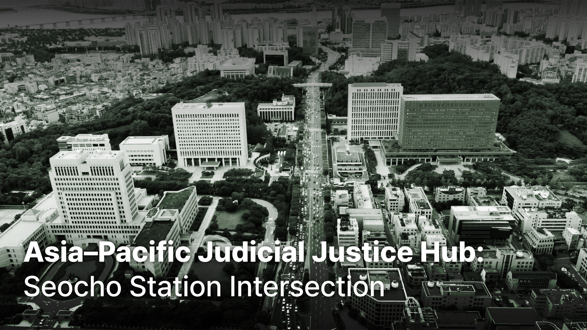 'The “Asia–Pacific Judicial Justice Hub” is a 536,000㎡ (approx.) street district around Seocho Station, home to Korea’s leading legal institutions—including the Supreme Court of Korea,